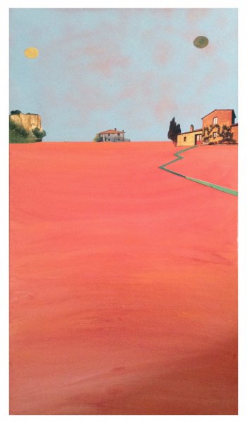 An environment of spray paint. The world is pieced together using images of Tuscany. There is no end to the ocean nor a beginning to the land.