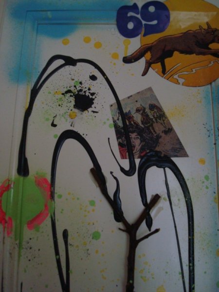collage, acrylic, spray paint on wood / 12" x 36" / 2008
