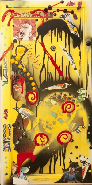collage, acrylic, spray paint on wood / 15" x 30" / 2008