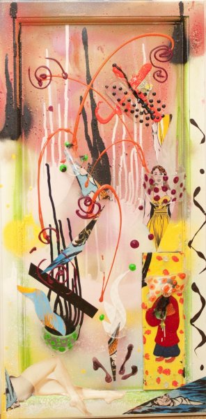 collage, acrylic, spray paint on wood / 15" x 30" / 2008