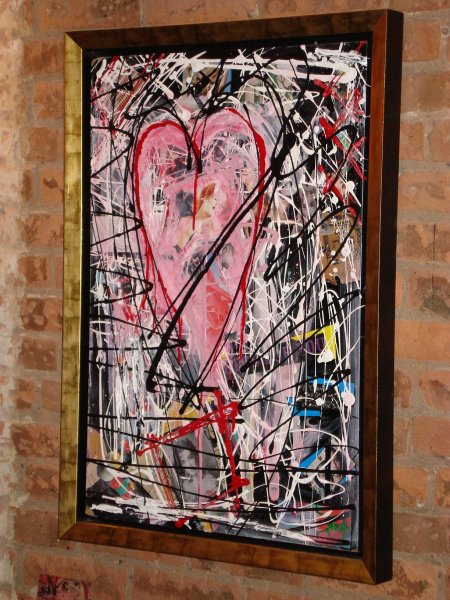 Perhaps my most beloved piece of all. Constructing The Broken Hearts Club was one of the most emotionally charged artistic experiences I've ever had. The piece began like many of my other-mainly earlier pieces-collages that focused primarily on the 2-d image; if at all, acrylic would only be used as a supplementary effect. However, once I completed the collage-which now only really constitutes a vague background at best-I felt like it needed change. At the time, the piece focused on a stunning Varga drawing depicting the first embrace of a newlywed couple. I splattered the piece with white paint, decided I didn't like it and promptly took a damp washcloth to the surface in hopes of clearing away the wet white paint from the image. In the process I dampened and damaged the picture of the bride and groom and was afraid I had destroyed the beauty of the piece. I quickly decided, though, that I could only move on from there and fix it-make it better-turn it into something even more thrilling. So I promptly took an equally dazzling, evocative Varga portrait of a lady-the one you see now-and slapped it over the newlyweds. It became sad, as if the lovers had been torn apart and replaced with a depiction of mourning; the saddest girl alive. I took out the red and pink acrylic, enclosed her in a bleeding heart and slashed it with the black. It named itself.